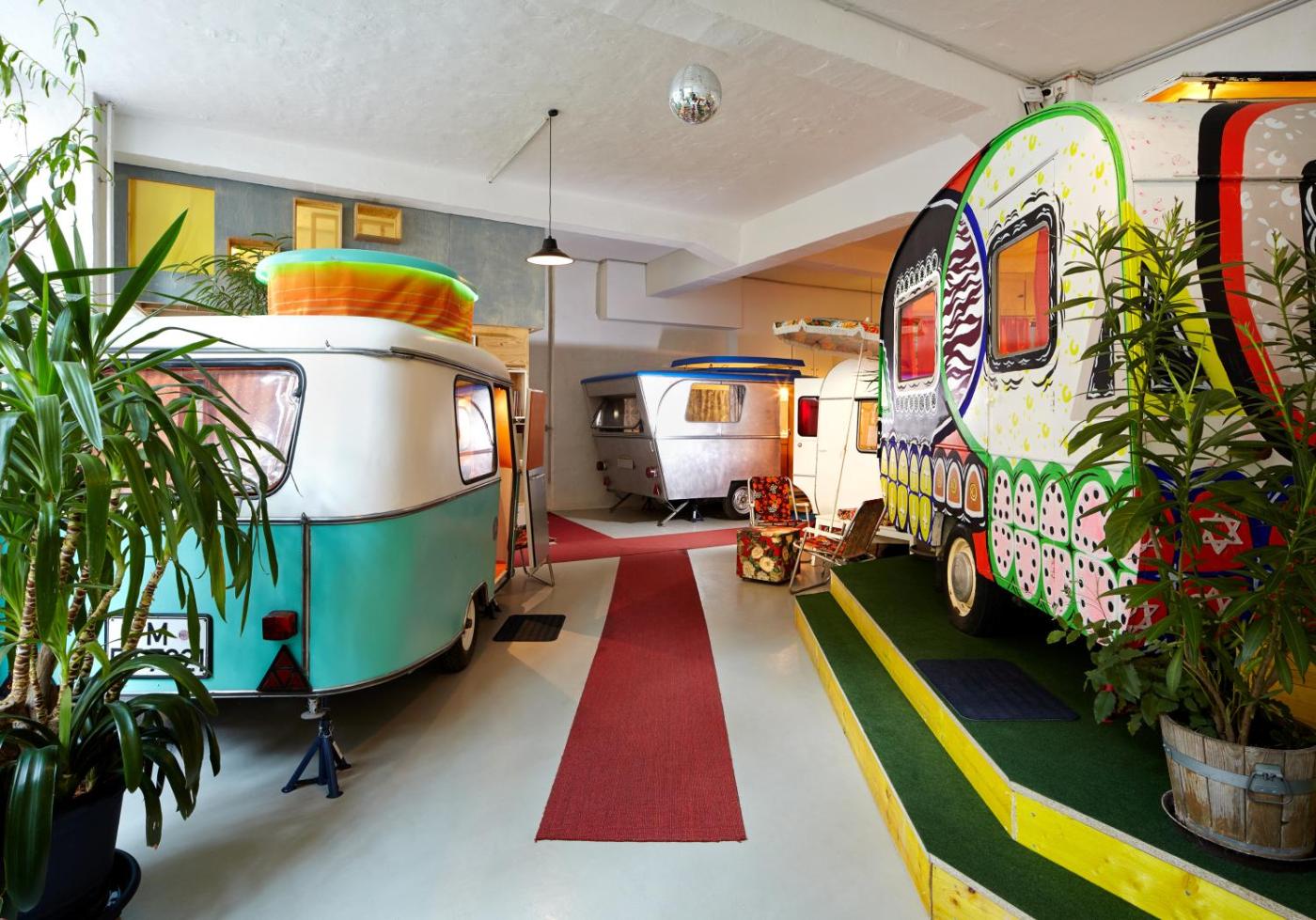 Der Hüttenpalast Berlin bietet eine einzigartige Auswahl an Unterkünften. Auf einem Indoor-Campingplatz in zwei früheren Fabrikhallen erwarten Sie Wohnwagen und Hütten im Retro-Stil. Jede Halle ist groß genug, um sechs Wohnwagen oder Hütten Platz zu bieten. In diesen Bereichen nutzen Sie ein Gemeinschaftsbad.