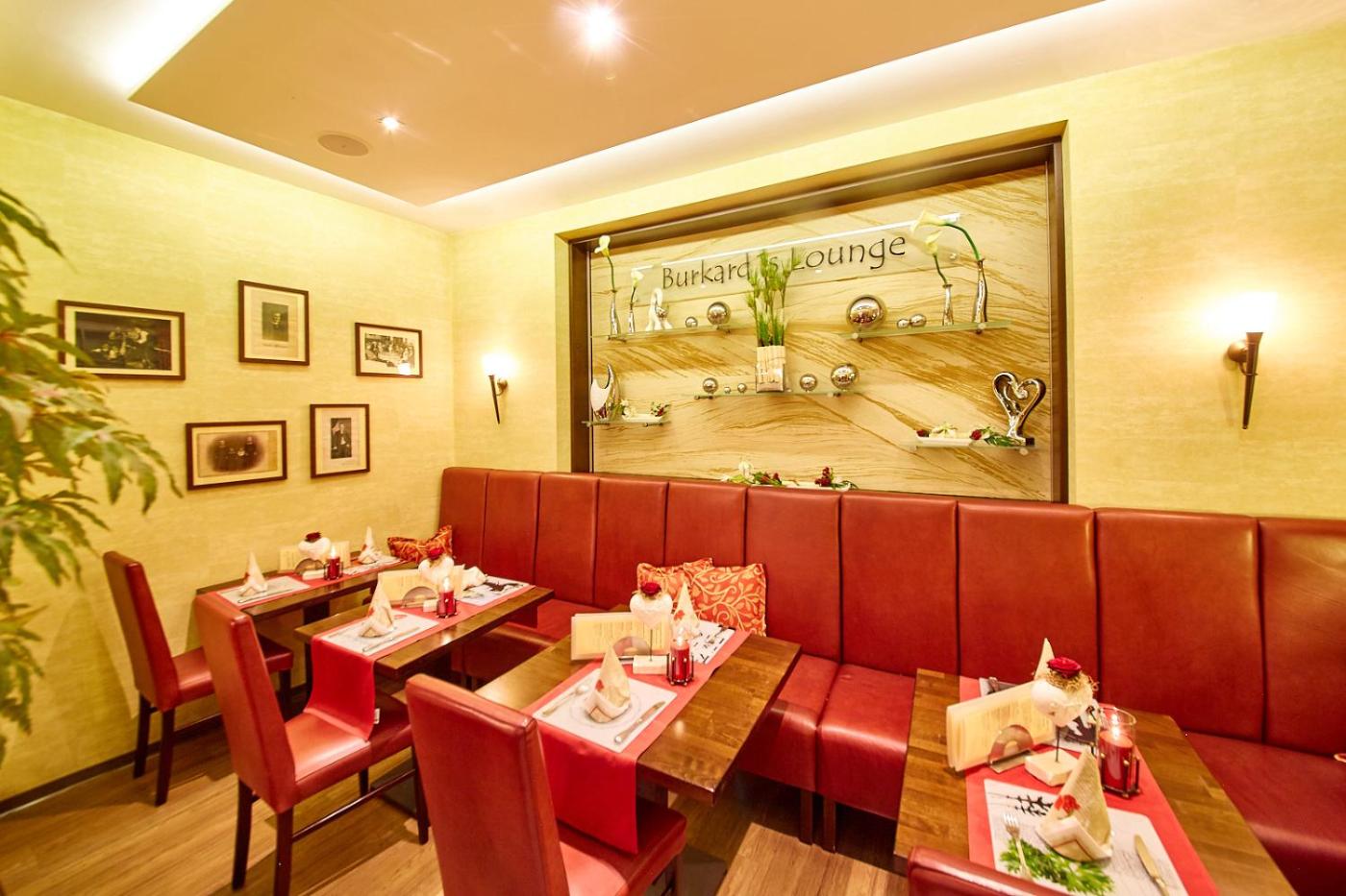 Eine einladende Atmosphäre erwartet Sie im gemütlichen Restaurant des Burkard. Freuen Sie sich auf Wild- und Fischgerichte, regionale Spezialitäten und erlesene Weine aus der Region.