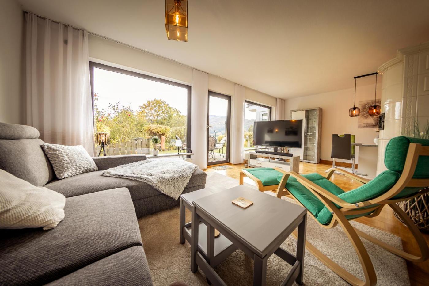 Die Unterkunft Ferienhaus Heimatliebe Rhön bietet 2 Schlafzimmer, 2 Badezimmer, eine gut ausgestattete Küche, einen Flachbild-TV und eine Sauna.