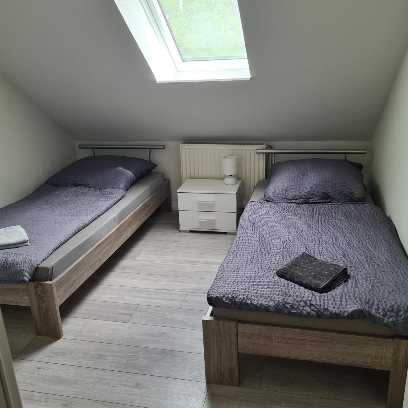 Zweibettzimmer. The twin room features a wardrobe and heating, as well as a shared bathroom boasting a shower. The unit has 2 beds. ;