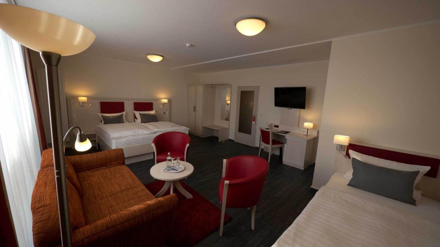 Die schallisolierten Zimmer des Hotel Westfalia sind modern eingerichtet und mit einem warmen Teppich ausgelegt. Jedes Zimmer hat einen Schreibtisch, einen gemütlichen roten Sessel sowie ein eigenes Bad.