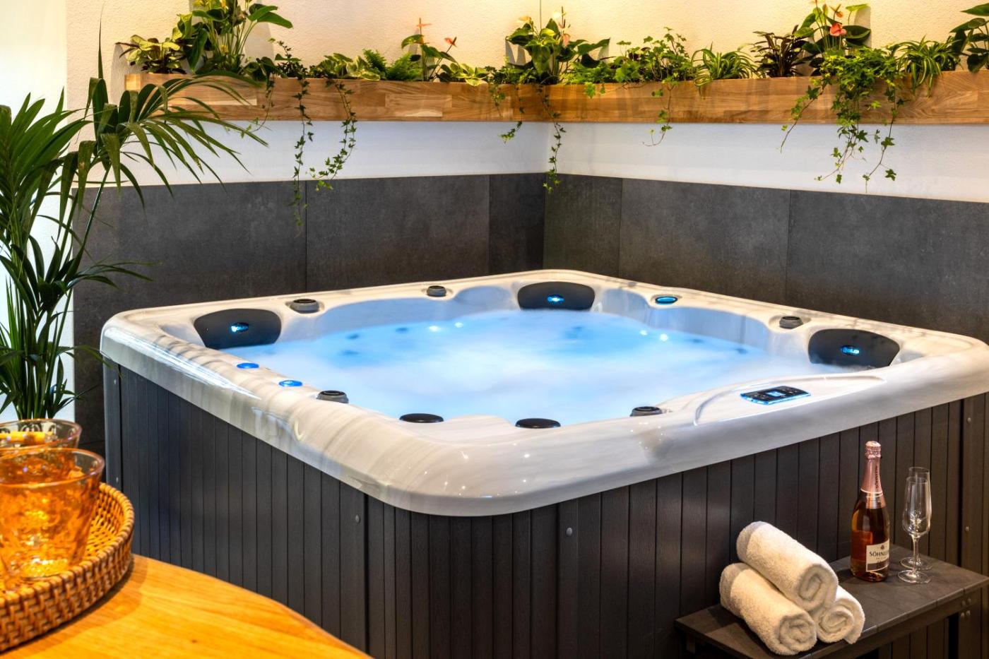 Der Wellnessbereich der Unterkunft Tropical Wellness Suite I Sauna I Whirlpool I Hot Tub I TV I BBQ besteht aus einer Sauna und einem Whirlpool.