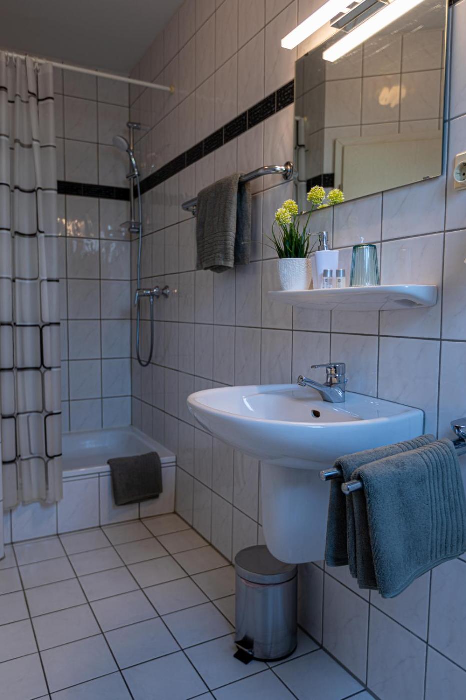 Einzelzimmer mit eigenem Bad. Offering free toiletries, this single room includes a private bathroom with a shower. The single rooms kitchenette, which has a refrigerator and a microwave, is available for cooking and storing food. The single room offers a private entrance, a tea and coffee maker, a seating area, a wardrobe and a flat-screen TV with satellite channels. The unit has 1 bed.