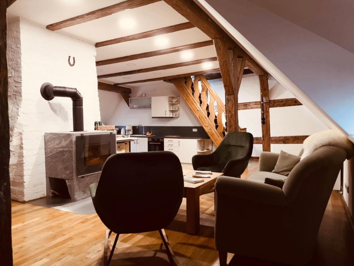 Apartment - auf 2 Etagen. This apartment features a fireplace. This spacious apartment features 1 living room, 1 separate bedroom and 1 bathroom with a shower. Guests can make meals in the kitchen that has a stovetop, a refrigerator, a dishwasher and kitchenware. The apartment features soundproof walls, a coffee machine, a seating area, a flat-screen TV with satellite channels, as well as city views. The unit has 2 beds.
