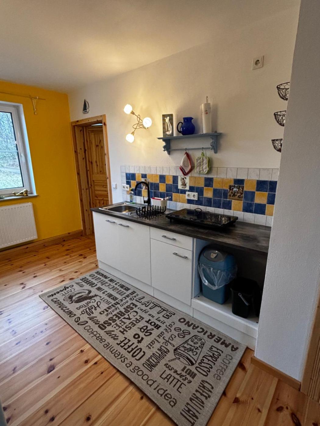 Es gibt einen Kühlschrank, eine Herdplatte und einen Toaster sowie auch eine Kaffeemaschine in der Küche.
