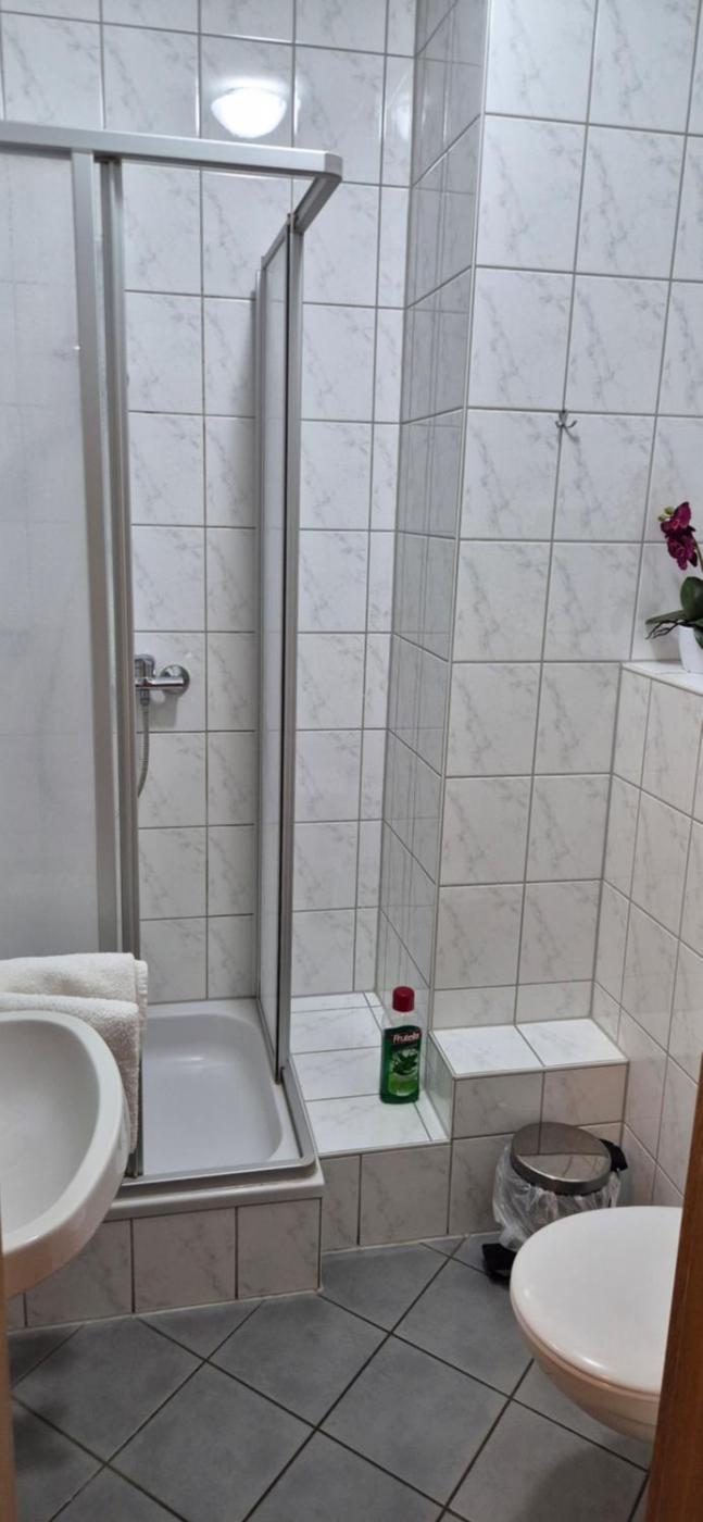 Einzelzimmer mit Gemeinschaftsdusche und -WC. The single room offers soundproof walls and a seating area, as well as a shared bathroom boasting a shower. The unit has 1 bed. ;