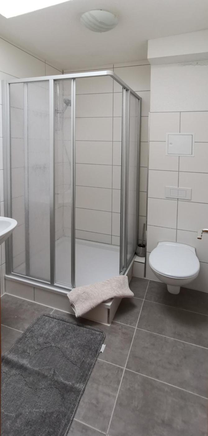 Dreibettzimmer mit Bad. The triple room offers a private entrance, a seating area, a terrace with city views as well as a private bathroom featuring a shower.