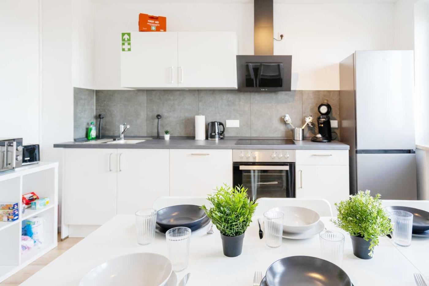 Apartment mit Balkon. This spacious apartment is comprised of 4 bedrooms, a kitchen and 2 bathrooms with a bath and a hairdryer. Guests can make meals in the kitchen that is fitted with a stovetop, a refrigerator, a dishwasher and kitchenware. This apartment features a washing machine, a tea and coffee maker, a flat-screen TV with streaming services and a balcony. The unit offers 7 beds.
