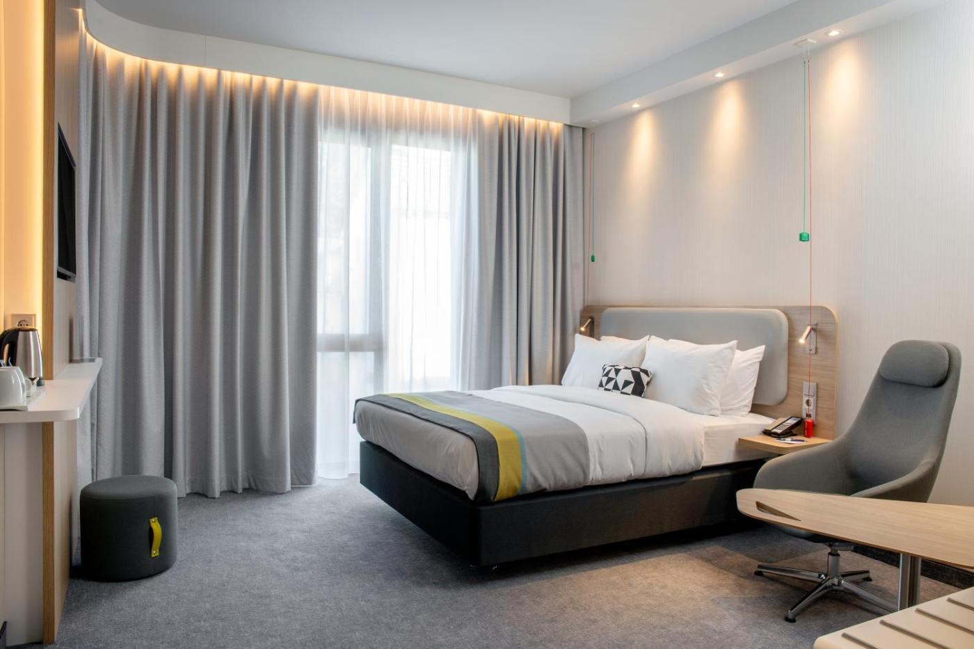 Die Unterkunft Holiday Inn Express Karlsruhe - City Park by IHG bietet den Gästen klimatisierte Zimmer mit einem Schreibtisch, einem Wasserkocher, einem Safe, einem Flachbild-TV und einem eigenen Badezimmer mit einer Dusche. Die Wohneinheiten verfügen über einen Kleiderschrank.