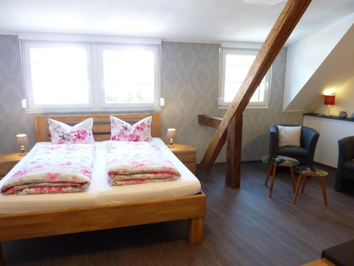 Doppelzimmer mit eigenem Bad und Balkon. Dieses Doppelzimmer verfügt über einen Flachbild-Sat-TV, ein eigenes Bad sowie einen Balkon mit Flussblick. Die Wohneinheit ist mit 1 Bett ausgestattet. ;