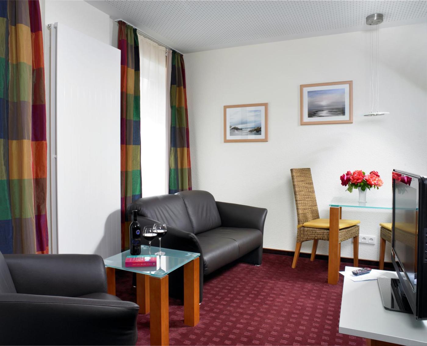 Doppelzimmer. Dieses moderne Zimmer ist klassisch eingerichtet und verfügt über einen kleinen Wohnbereich mit Sat-TV und ein angeschlossenes Bad mit einem Haartrockner. ;