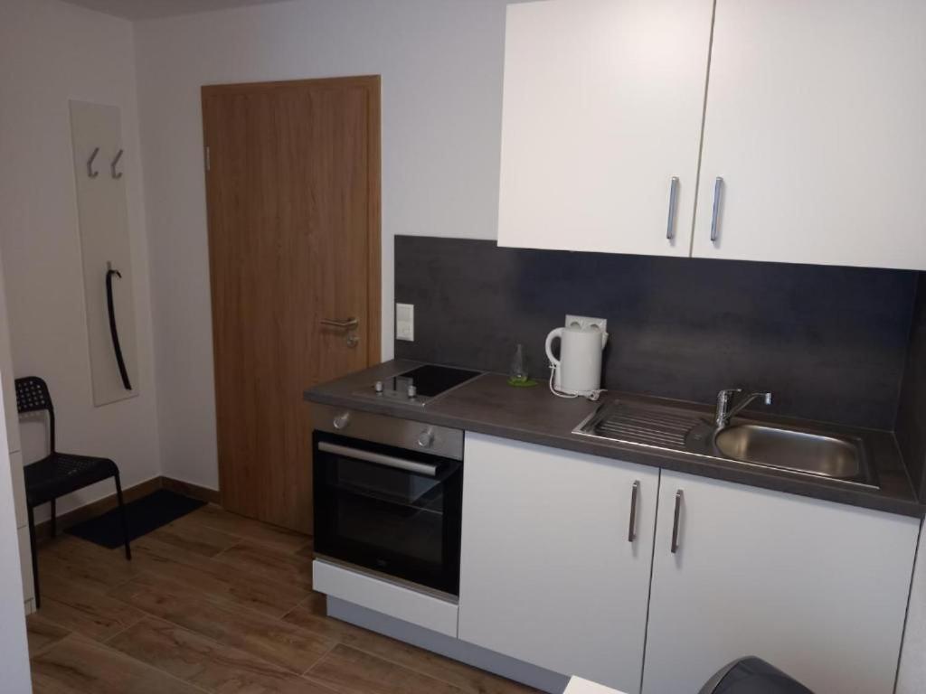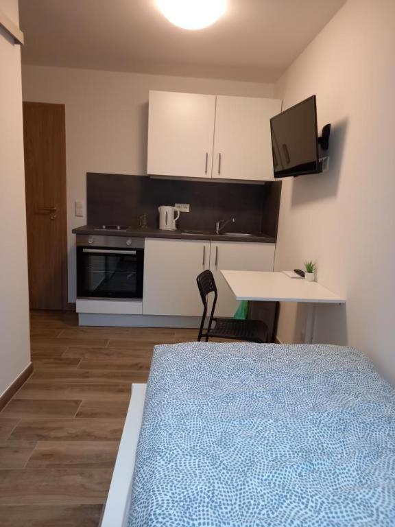 Einzelzimmer mit eigenem Bad. The single room features an electric kettle and tumble dryer, as well as a private bathroom boasting a walk-in shower. The well-fitted kitchenette features a stovetop, a refrigerator, kitchenware and an oven. The single room has tiled floors, a seating area with a flat-screen TV with satellite channels, a washing machine, soundproof walls, as well as a wardrobe. The unit has 1 bed.