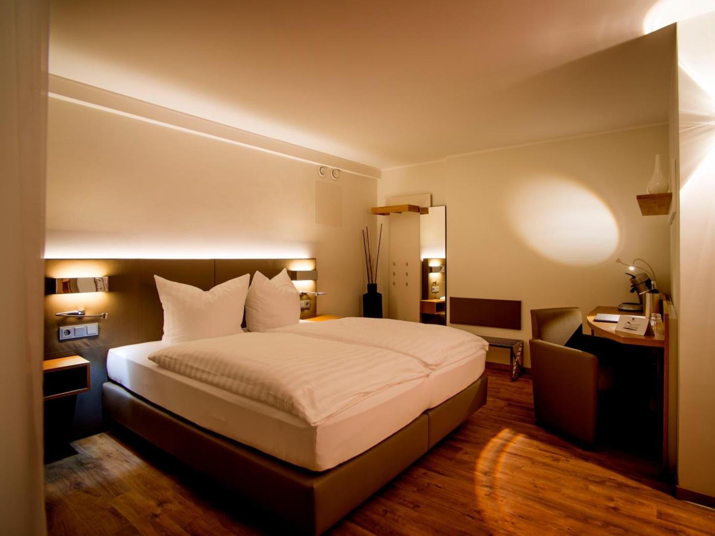 Doppelzimmer mit Gartenblick. The double room provides a safe deposit box, heating, as well as a private bathroom featuring a walk-in shower and a hairdryer. Rooms on the upper floors are reachable by lift. The unit offers 1 bed. ;