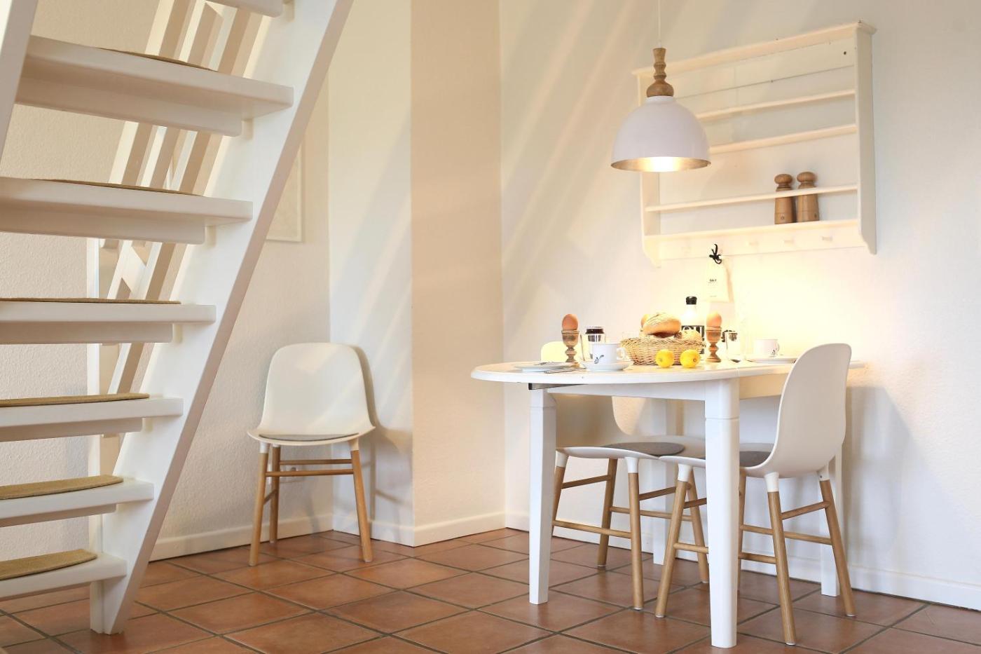 Apartment mit 1 Schlafzimmer. Einige Apartments verfügen über einen Balkon oder eine Terrasse mit Blick auf den Rosengarten und das nordfriesische Marschland.