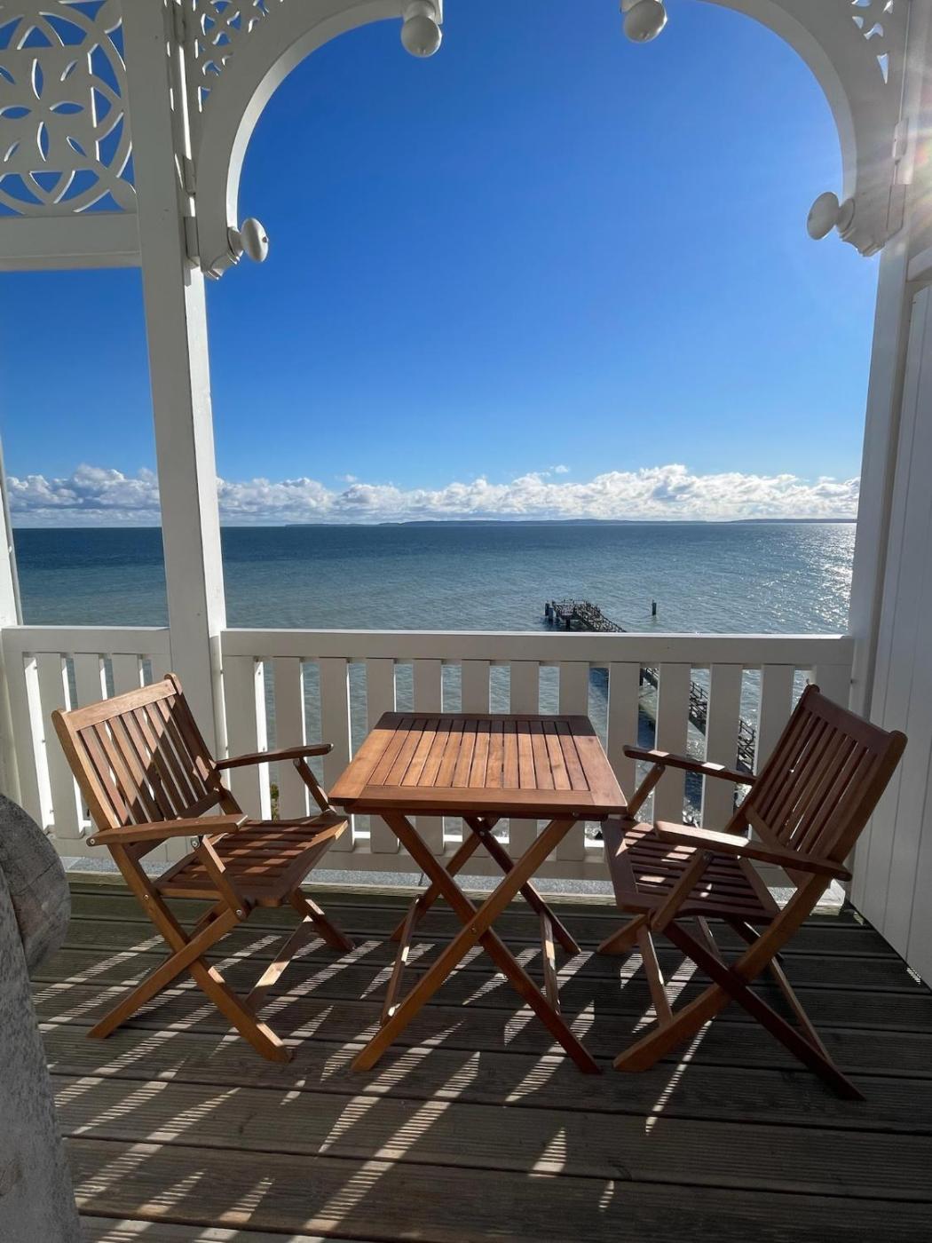 Apartment mit Meerblick. Dieses Apartment verfügt über einen geräumigen Südbalkon mit Blick auf den Hafen von Sassnitz und die Ostsee. ;