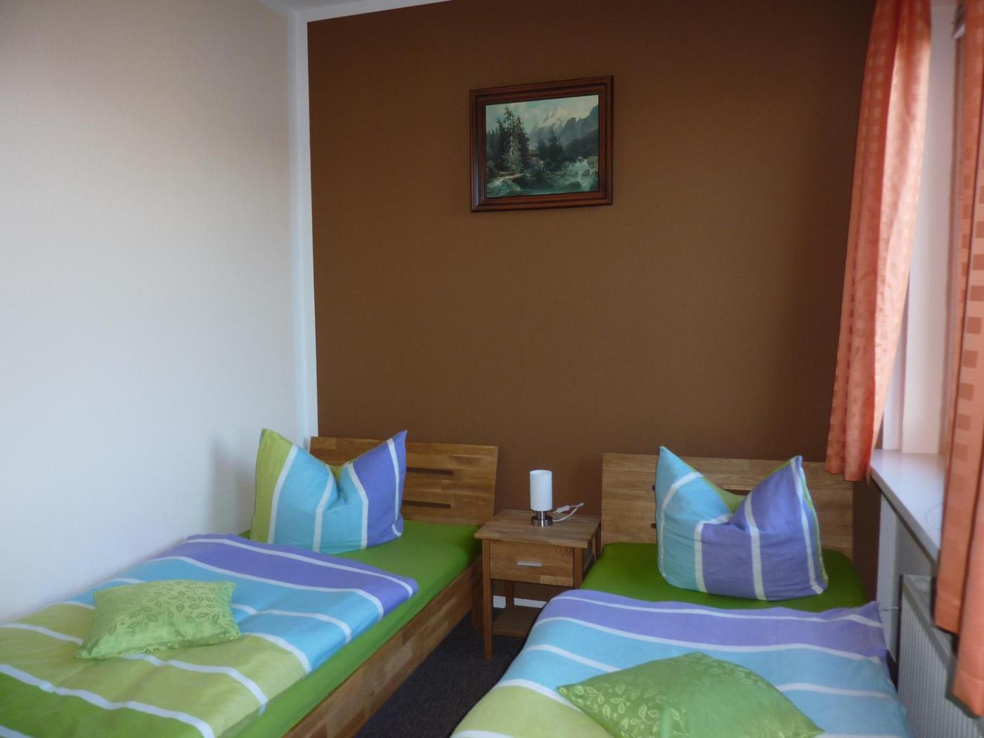 Kleines Zweibettzimmer. The twin room features a private bathroom equipped with a shower and a hairdryer. The twin room provides a wardrobe, a carpeted floor, heating, a flat-screen TV with satellite channels, as well as garden views. The unit offers 2 beds. ;