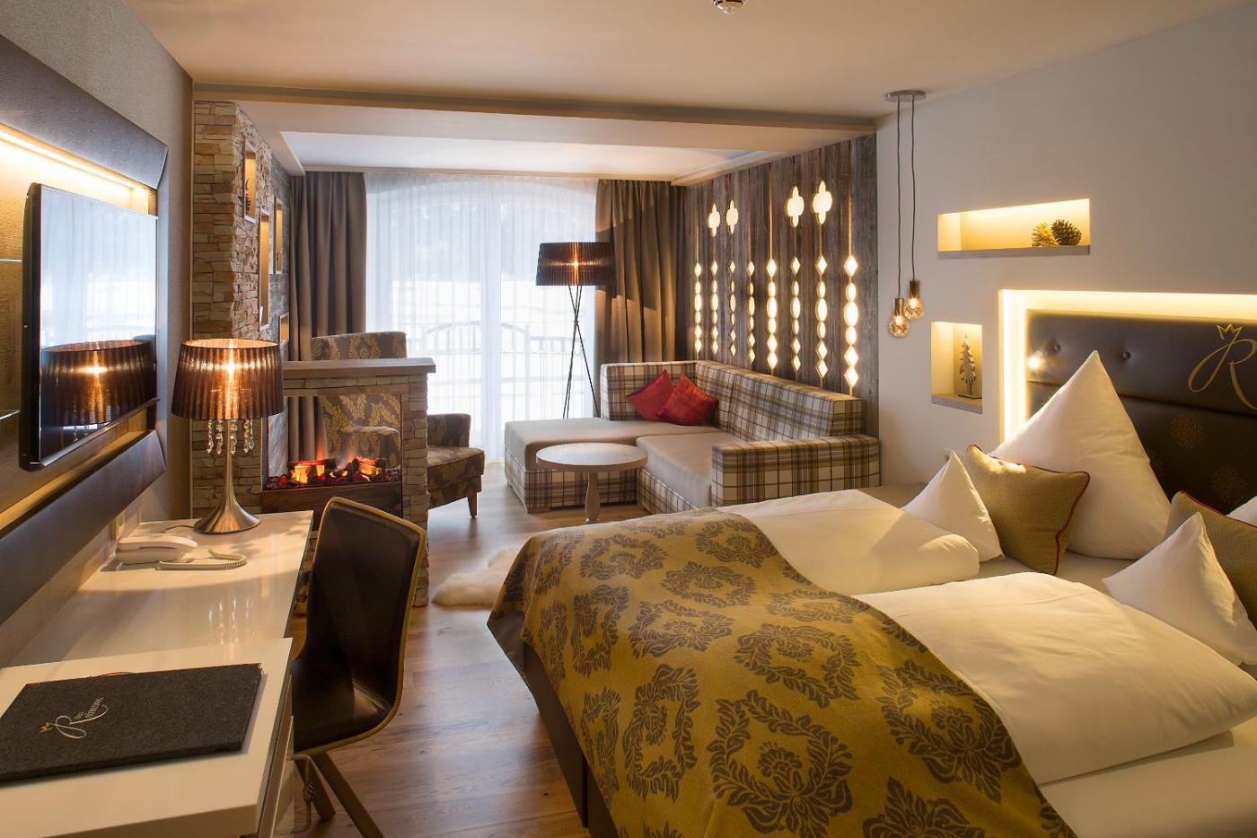 AlpenTraum Deluxe Doppelzimmer. Dieses Doppelzimmer verfügt über einen Balkon oder eine Terrasse, ein Sofa und einen Kamin. ;