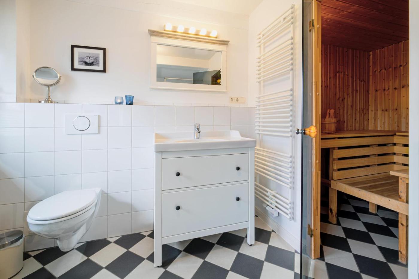 Apartment mit Meerblick. Guests will have a special experience as this apartment offers a sauna and a fireplace. Featuring 3 bedrooms, this spacious apartment offers 2 bathrooms with a shower, a seating area and terraceyou can relax. Guests will find a stovetop, a refrigerator, a dishwasher and kitchenware in the fully equipped kitchen. The apartment also offers a barbecue. The apartment provides a washing machine, a coffee machine, a wardrobe, a TV with satellite channels, as well as sea views. The unit has 3 beds.