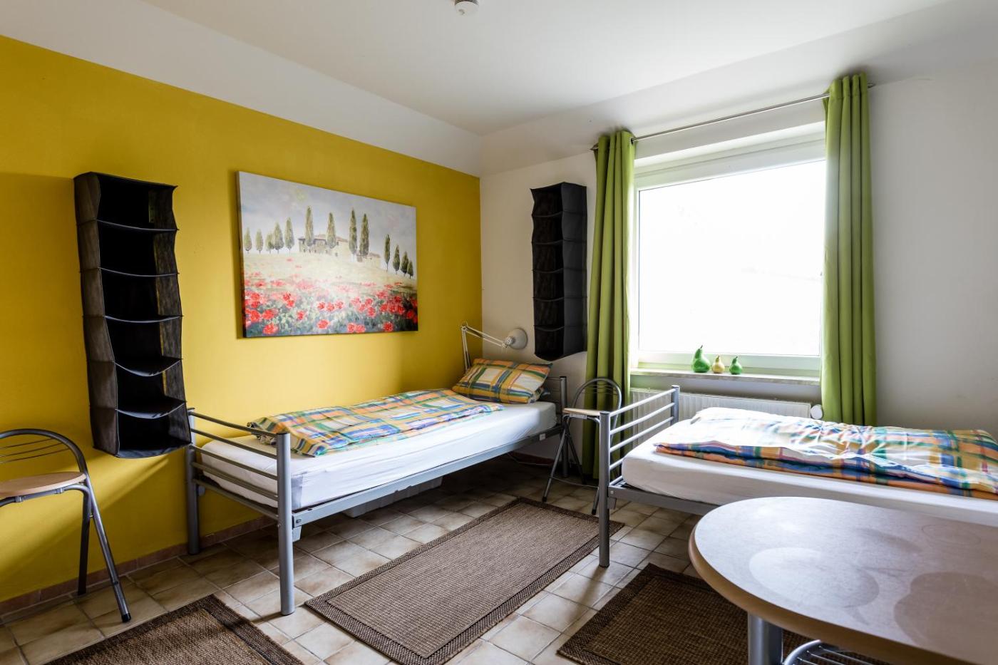Standard Dreibettzimmer. This triple room offers a shared bathroom, and heating. The triple room features a washing machine, an electric kettle, tumble dryer, a flat-screen TV with satellite channels, as well as garden views. The unit has 3 beds.