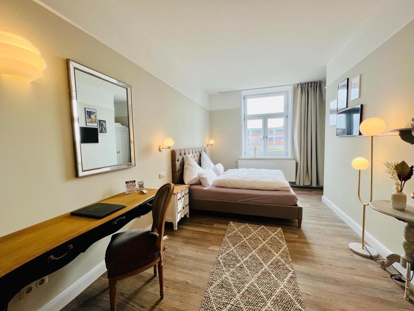 Zimmer mit Kingsize-Bett und Hafenblick im Hochparterre. Das Doppelzimmer verfügt über einen Kleiderschrank, einen Wasserkocher sowie ein eigenes Bad mit einer Dusche und einem Haartrockner. Die Wohneinheit ist mit 1 Bett ausgestattet. ;