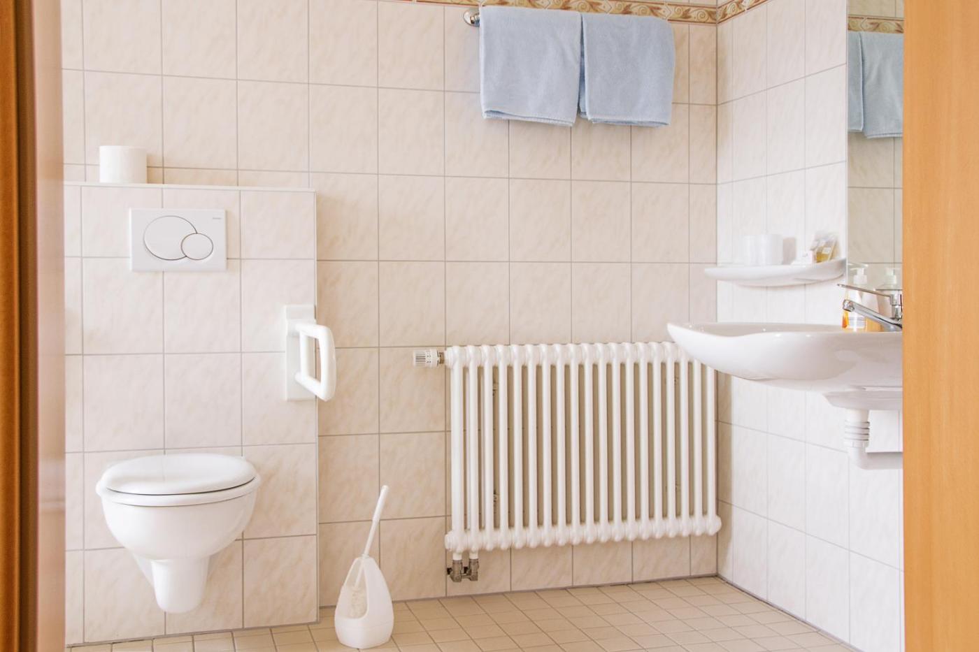 Doppelzimmer - barrierefrei. The double room features a carpeted floor, heating, as well as a private bathroom featuring a bath or a shower and a hairdryer. The double room offers soundproof walls, a wardrobe, a high chair for children, a flat-screen TV with satellite channels, as well as garden views. The unit offers 2 beds.