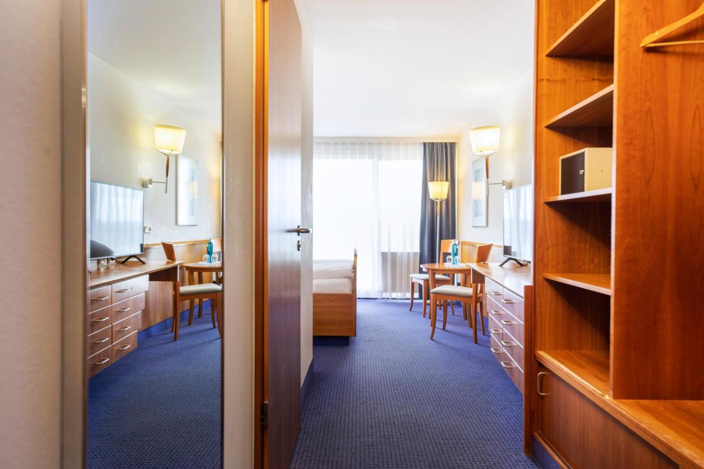 Standard Einzelzimmer. The single room features a wardrobe, a carpeted floor, a balcony with garden views as well as a private bathroom boasting a walk-in shower. The unit has 1 bed. ;